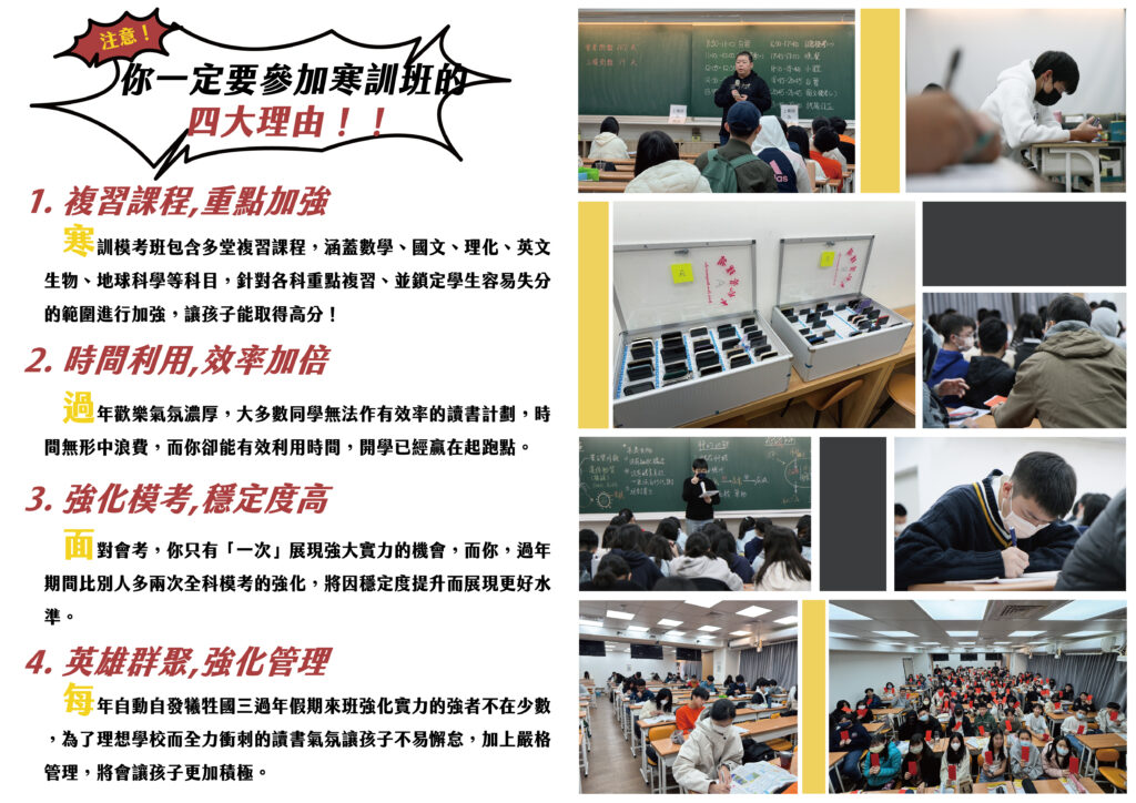 115國九寒訓模考班九年級課程 / 2025 年 10 月 24 日 🔍點我諮詢正式課程 2026年寒訓模考班 特別課程,重點加強針對語文、數學、理化等主要科目的重點內容和難點進行專項訓練幫助學生針對性地提升成績,提高考試得分 時間利用,效率加倍合理安排課程時間表,充分利用每一刻進行學習同時兼顧學生的休息時間,確保身心健康 強化模考,精定度高提供多次模擬考試,貼近實際考試情況讓學生熟悉考試流程,提高考試信心和應試技巧 英語聽說,強化管理針對英語聽說能力的需求,設有專項訓練輔以自主學習管理,全面提升學生的綜合實力總的來說,這個寒訓模考班致力於為學生提供一個全面、高效的備考方案,在課程設置、時間安排、模擬考試以及英語訓練等方面都有針對性的安排,幫助學生在各方面都得到全面提升,為即將到來的考試做好充分準備。