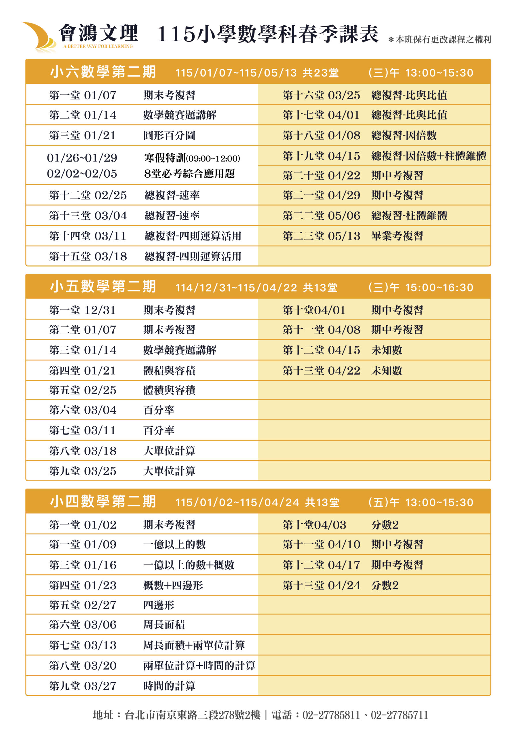 115小四~小六數學 春季課表