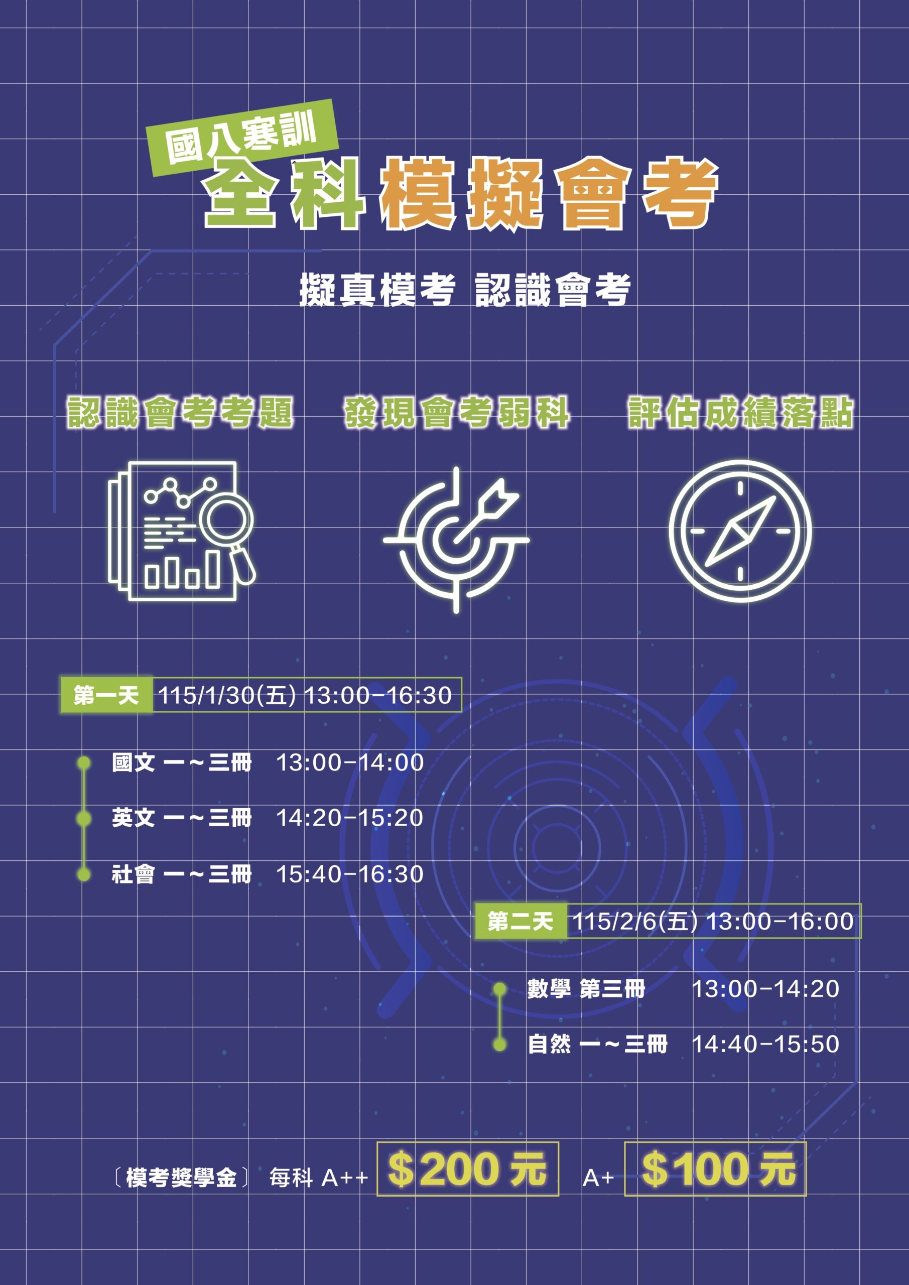 115國八寒訓冬令營&一~三冊模擬測驗八年級課程 / 2025 年 12 月 19 日 🔍點我諮詢正式課程 115國八幾何寒訓冬令營&一~三冊全科模擬測驗 對象: 國中八年級學生 課程亮點:由數學蕭老師主講,專業教學全面涵蓋國八幾何重點內容循序漸進,由淺入深,幫助學生建立完整的幾何基礎採小班制,師生比例高,能夠照顧到每位學生的需求 課程時間: 1/26、1/27、1/28、1/29、 2/2、2/3、2/4、2/5,下午13:00~16:00一~三冊全科模擬測驗📣測驗費用:完全免費📅 考試時間▪ 第一天|115/1/30(五)13:00–16:30 國文・英文・社會▪ 第二天|115/2/6(五)13:00–16:00 數學・自然📅 考試範圍:一~三冊🎯 模考獎勵金・每科 A++:$200 元・每科 A+:$100 元・班內生+班外生均適用 讓我們一起出發,掌握幾何關鍵,為未來的學習打下堅實的基礎! 名額有限,快來報名吧!