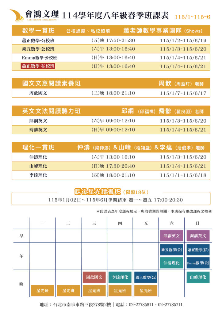 114七升八秋季班課表 2025 年 12 月 5 日 歷屆學生表現傑出 瞭解更多 眾多學生好評推薦 瞭解更多 立即預約諮詢 填寫線上諮詢表單,將有專人主動與您聯繫。 … 114七升八秋季班課表 閱讀全文 »