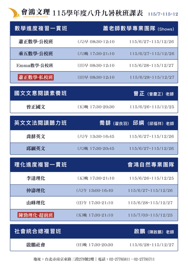114八升九秋季全科班課表 2025 年 9 月 24 日 歷屆學生表現傑出 瞭解更多 眾多學生好評推薦 瞭解更多 立即預約諮詢 填寫線上諮詢表單,將有專人主動與您聯繫。 … 114八升九秋季全科班課表 閱讀全文 »